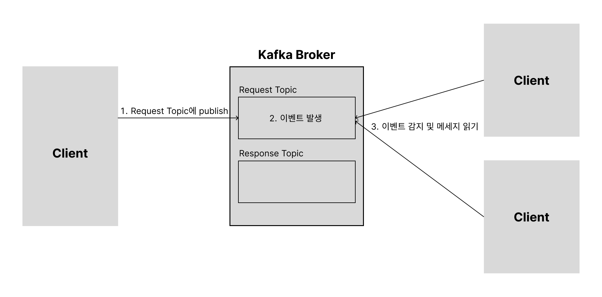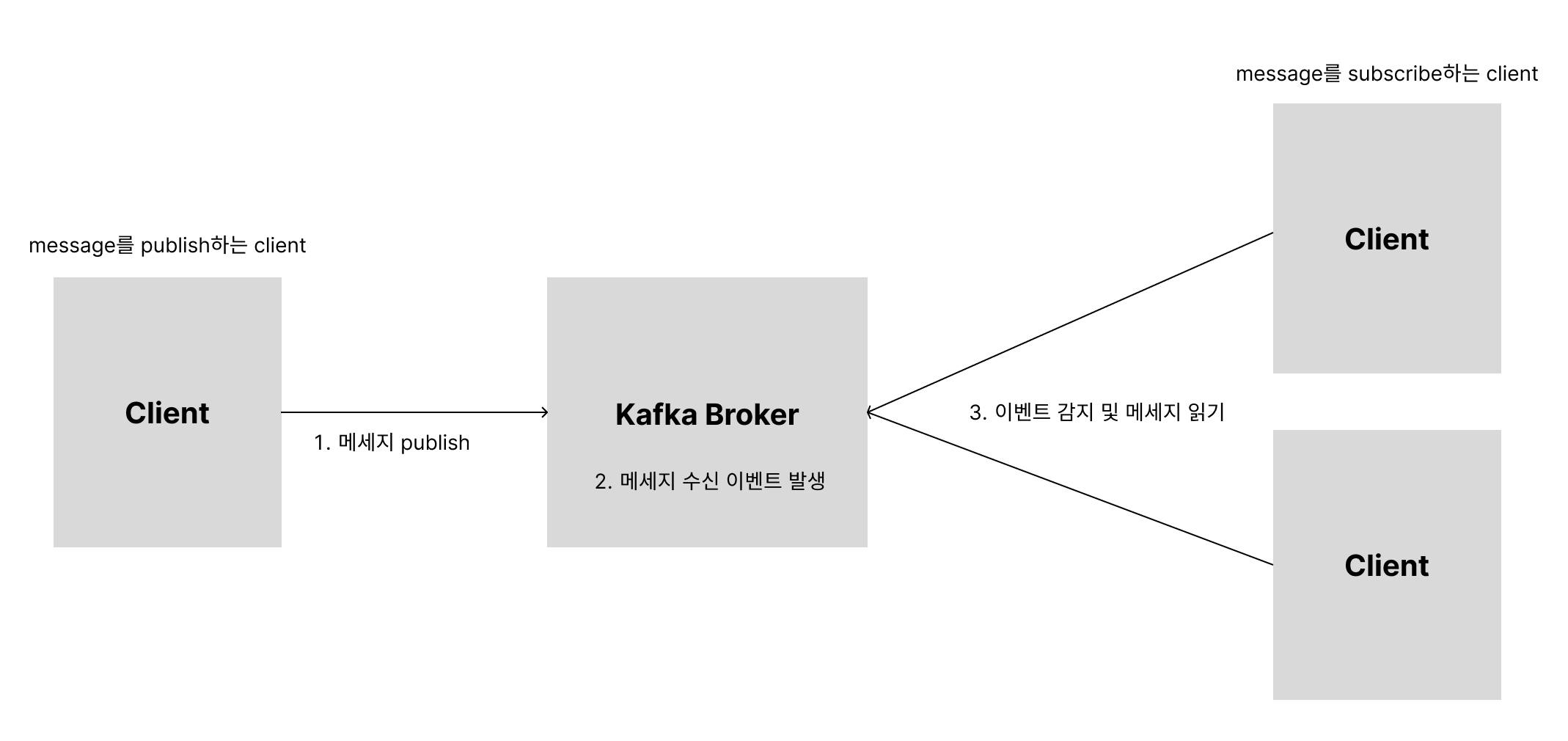 Broker는 클라이언트가 메세지를 전송할때까지 대기하고 메세지 수신 시 이벤트를 발생시키는 역할을 한다. 브로커가 이벤트를 발생시키면 메세지를 구독하고 있는 특정 클라이언트들은 브로커에 발생한 이벤트를 감지해 메세지를 읽어온다.