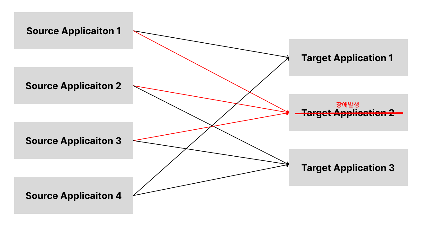 카프카는 Linked-In에서 소스 애플리케이션고 타켓 애플리케이션을 분리하기 위해 만들어졌다. 기존의 데이터 파이프라인은 아래와 같이 각각의 애플리케이션을 직접 연결하는 구조였는데 아래와 같이 타겟 애플리케이션에 장애가 발생하면 소스 애플리케이션에도 치명적인 문제가 발생한다. 또한, 아키텍처가 복잡해짐에따라 애플리케이션의 갯수가 많아지면서 데이터 파이프라인도 기하급수적으로 복잡해졌다. 이러한 문제를 해결하고자 Linked-In에서는 카프카를 만들어냈고 카프카는 애플리케이션을 직접 연결하는 방식이 아니라 중앙에서 데이터를 처리하는 방식으로 모든 애플리케이션이 카프카를 통해 데이터를 수집하고 분배한다.
