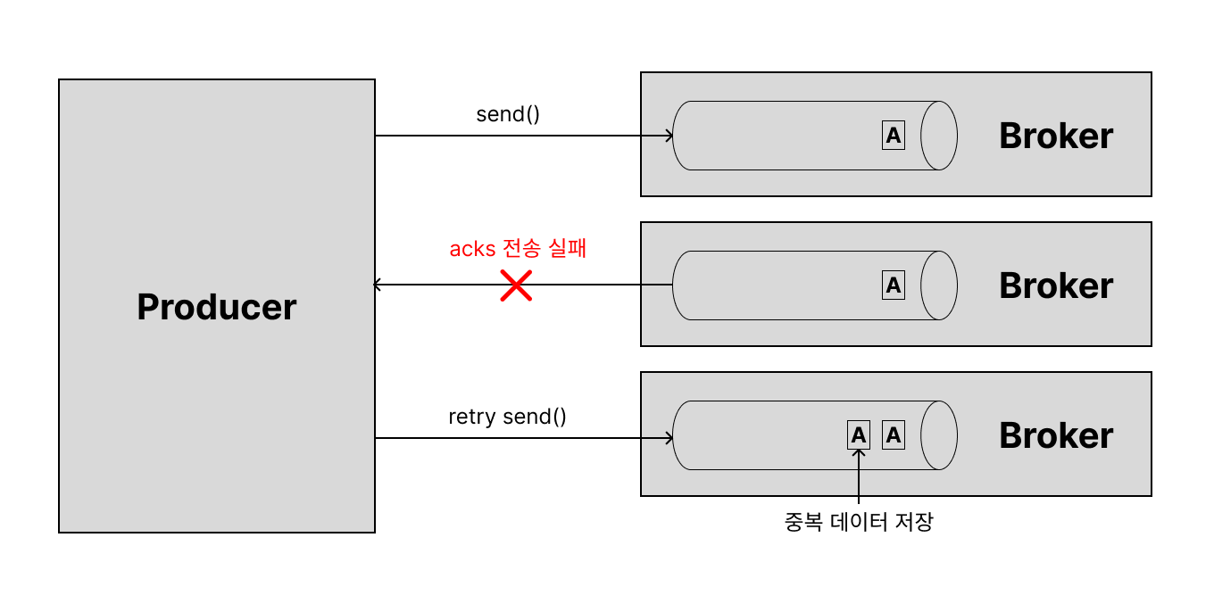 멱등성이란 여러 번 연산을 수행하더라도 동일한 결과를 나타내는 것을 말한다. 멱등성 프로듀서는 특정 이슈에 의해 동일한 레코드를 파티션에 여러 번 전송하더라도 카프카 클러스터에는 단 한 번만 전달(exactly once delivery)함을 보장한다.