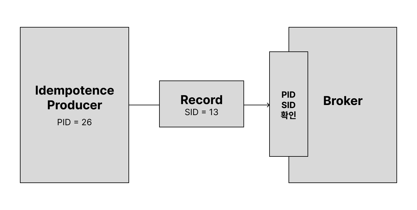 멱등성 프로듀서가 단 한 번만 전달이 가능한 이유는 브로커에 데이터를 전달할때 프로듀서의 고유한 ID값인 프로듀서 아이디(PID)와 레코드의 전달 번호인 시퀀스 아이디(SID)를 함께 전달하기 때문이다. 브로커는 요청이 들어오면 PID와 SID를 확인해 동일한 메세지의 적재 요청이 오더라도 중복 데이터를 선별해 정확히 한번만 브로커에 적재되도록 동작한다.