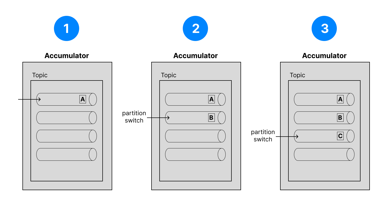 UniformStickyPartitioner의 경우 message key가 null이 아니라면 key값과 partition을 매칭해 레코드를 전송한다. hash key를 이용하기 때문에 이후에 같은 key값이 들어온다면 같은 partition을 매칭한다. message key가 null인 경우에는 RoundRobin개념을 이용해 우선순위(#)가 낮은 buffer부터 record를 균일하게 매칭한다. 아래 그림을 보면 accumulator의 buffer에 record를 batch size만큼 몰아서 채우고 다 채웠다면 다음 buffer로 이동해 데이터를 batch size만큼 적재해 전송한다.