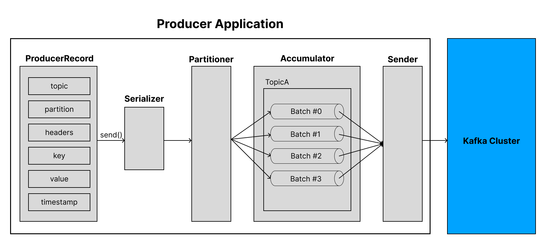 kafka library를 이용해 구현한 프로듀서 애플리케이션은 아래와 같은 구조를 가진다. producer record를 사용해 메세지를 전송하고 직렬화 후 partitioner가 producer record를 어떤 partition으로 보낼지 결정해 record에 set한다. 이 후, 설정한 배치사이즈만큼 producer-record가 accumulator에 배치 형태로 저장되고 sender가 accumulator의 데이터를 받아와 leader-partition에 전송한다.