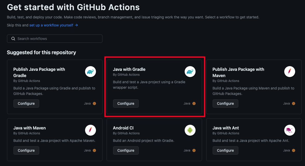 Github Actions 이용을 위해 repository에 들어가 Actions를 클릭 후 프로젝트에 맞는 Build 옵션을 선택한다. 본인은 Gradle기반 프로젝트를 이용하기 때문에 아래와 같이 선택하였다.