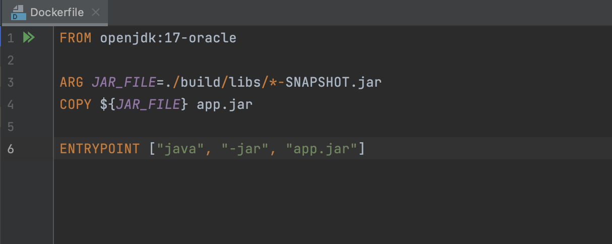 Docker Image 생성을 위해 Spring 프로젝트 root 경로에 Dockerfile을 생성한 후 Github repository에 push한다. 본인은 현재 oracle의 jdk17버전을 이용하고 있는데 프로젝트 jdk버전에 맞춰 FROM 절을 수정해주면 된다.