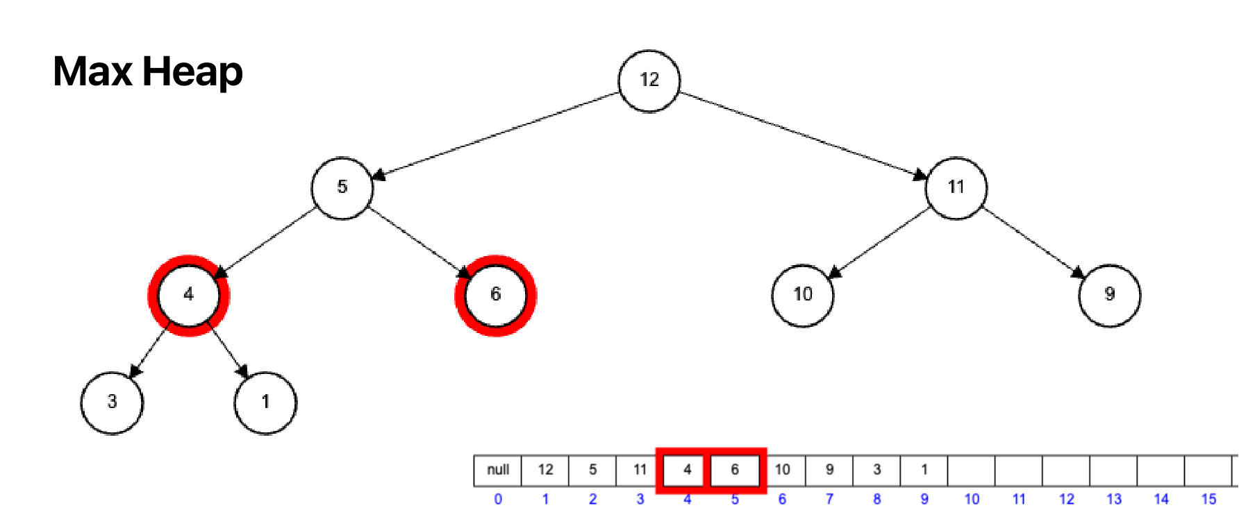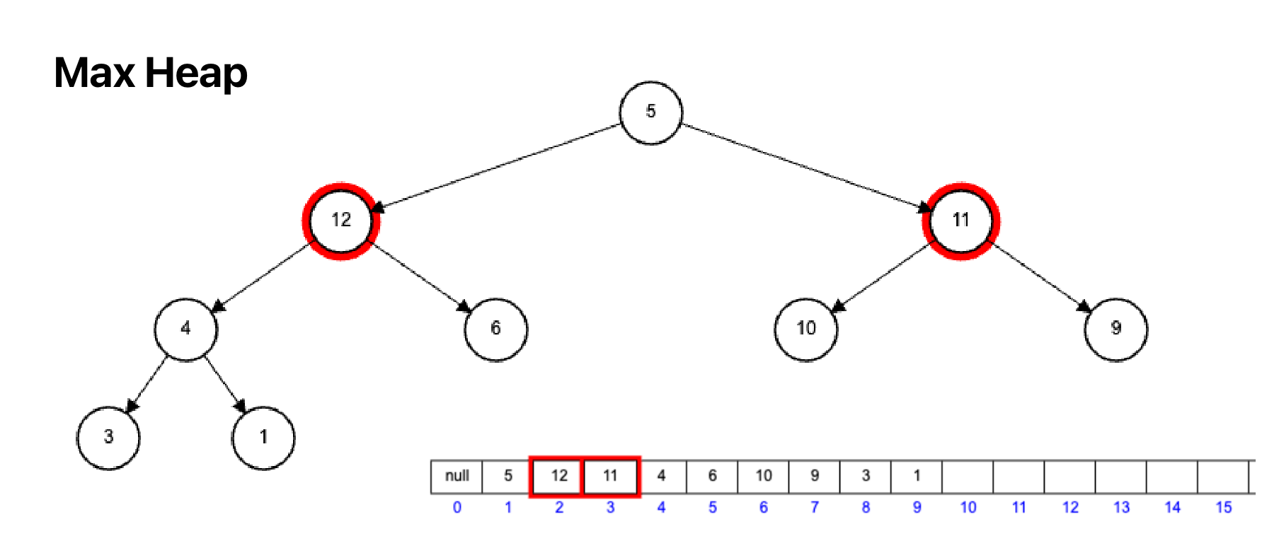 5를 루트노드에 위치시켰으면 왼쪽, 오른쪽 자식노드와의 값을 비교한다. 12, 11이 모두 5보다 크기 때문에 둘 중 더 높은 12와 위치를 바꾼다. 값이 더 높은 노드와 위치를 교환하는 이유는 Max Heap의 조건을 만족해야하기 때문이다.