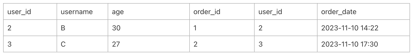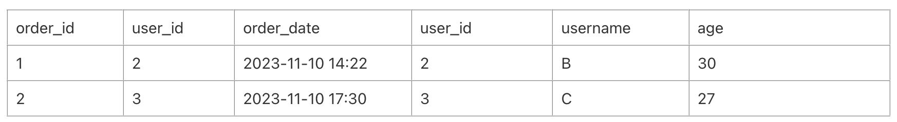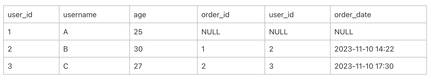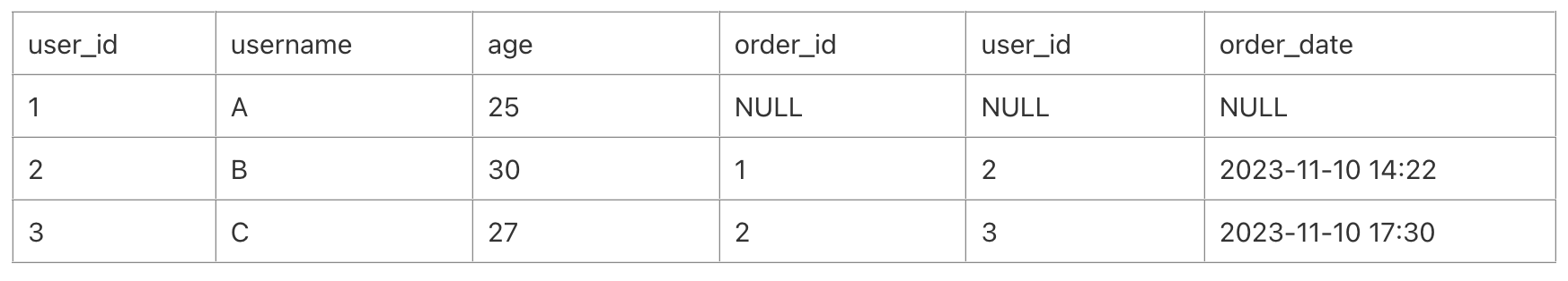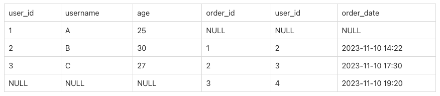 그럼 USER 테이블과 ORDER 테이블의 위치를 바꿔서 실행하면 어떻게 될까? 아래와 같이 SQL을 작성했을때 결과 테이블은 아래와 같다. USER 테이블과 Join된 ORDER 테이블의 모든 레코드가 출력된다.