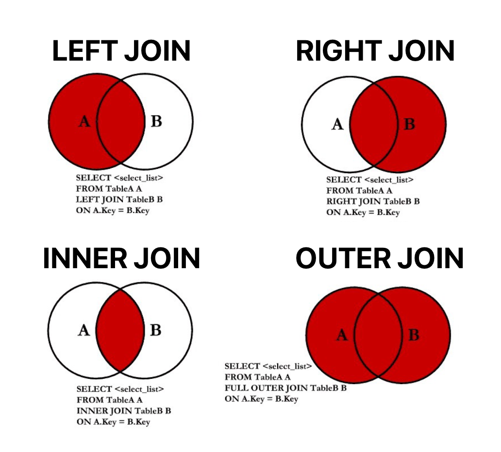 오늘은 위 7개 형식의 Join 중 대부분의 Join에서 사용되는 아래 4가지 Join형식을 알아보도록 하겠다. LEFT, RIGHT, INNER, OUTER 형식이 있고, 차례대로 살펴보자.