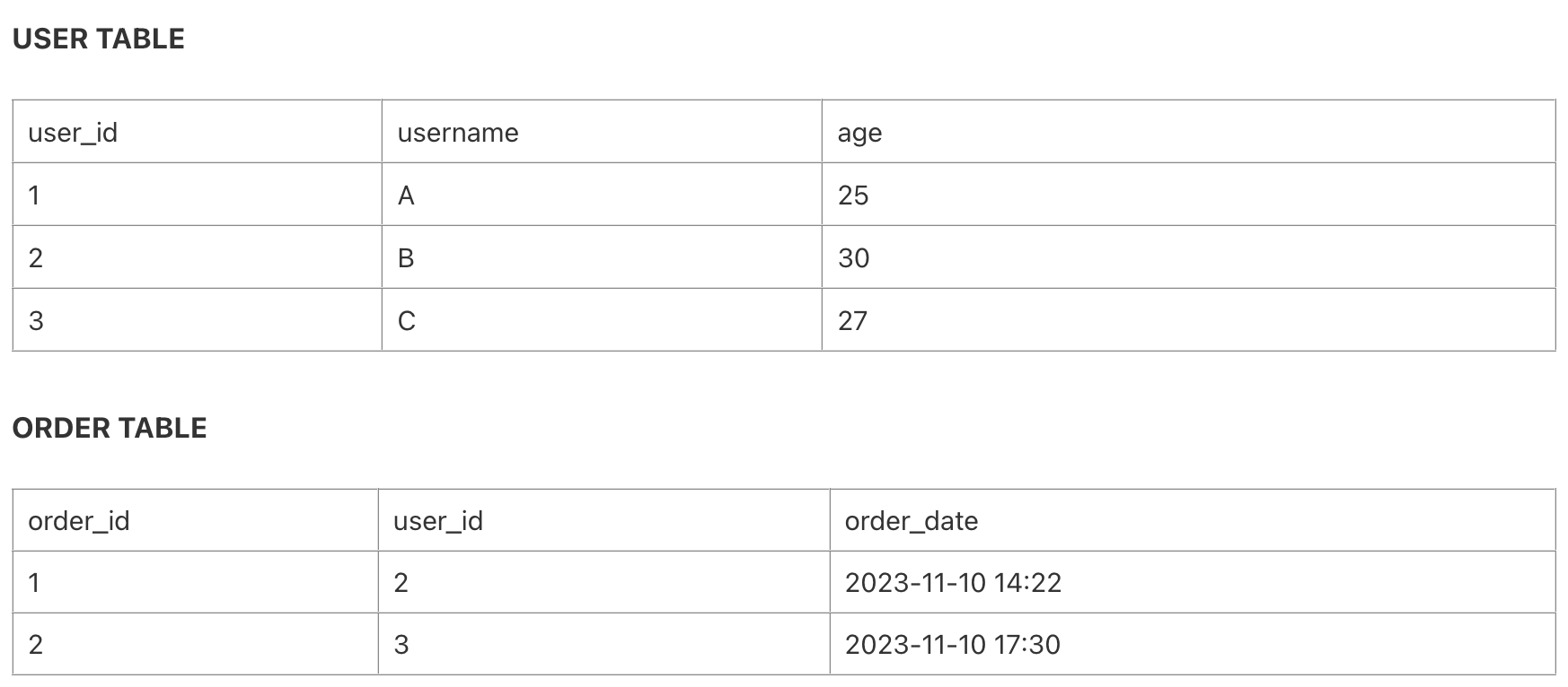 위 과정을 SQL로 작성해보면 아래와 같다. 코드를 보면 FROM에 USER 테이블이 들어가있는데 즉, Left Join에서 FROM절에 들어가 있는 테이블이 기준 테이블이 되는 것이다.