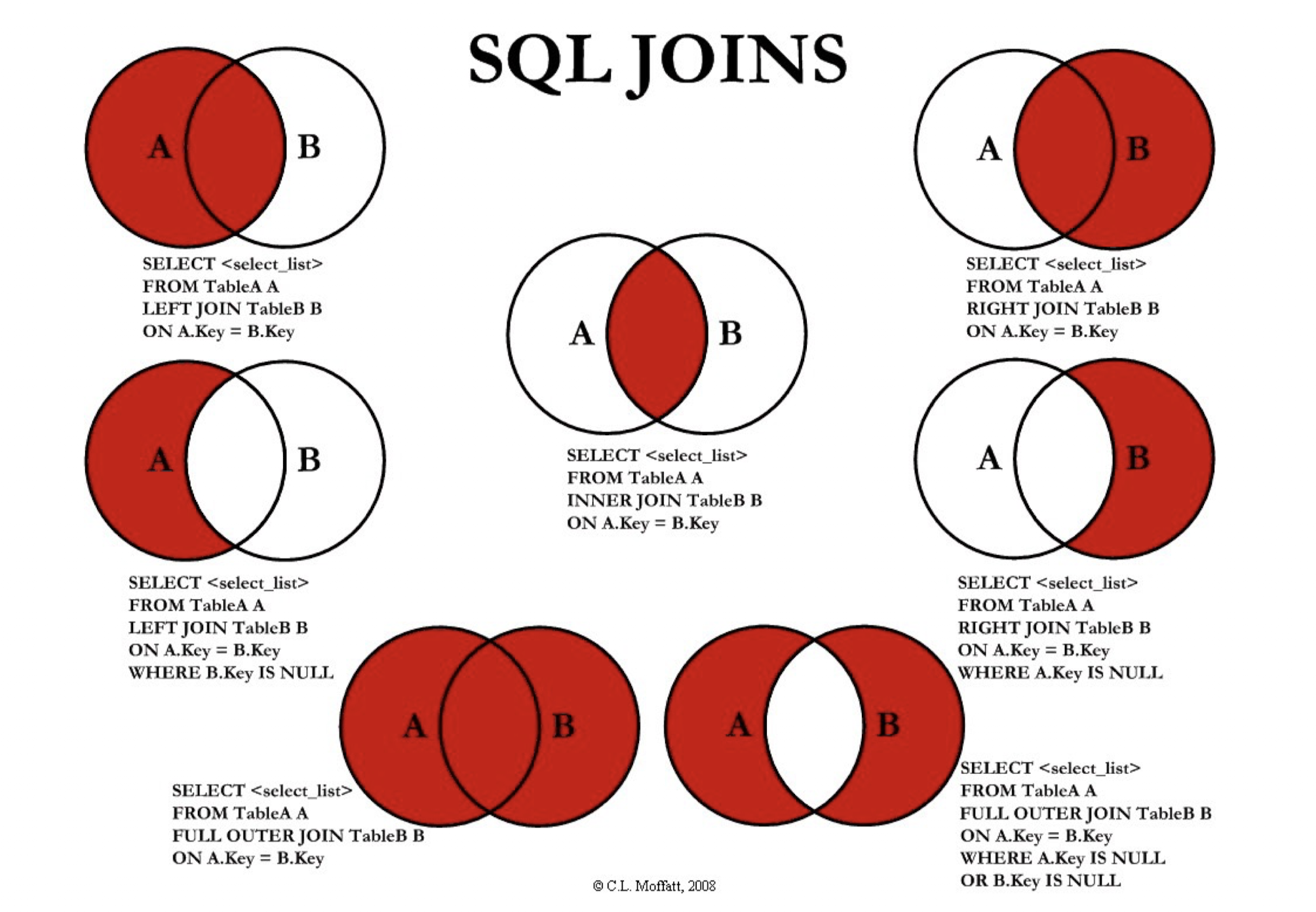 두 개 이상의 테이블을 서로 연결하여 데이터를 검색할 때 사용하는 방법이다. 분리되어 있는 여러 테이블을 사용자가 원하는 형식으로 조합해야할때 SQL Join문을 이용해 해결할 수 있다. Join은 아래와 같이 7개의 형식으로 사용할 수 있다.