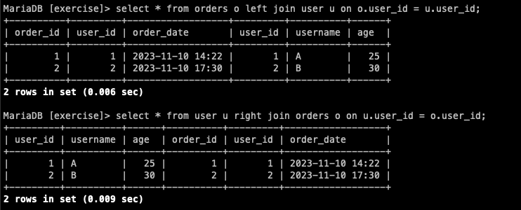 위 결과에서는 ORDER 테이블을 기준으로 Left Join을 진행하였는데 이 결과는 USER 테이블을 기준으로 Right Join을 한 Column의 순서만 다를 뿐 레코드의 결과는 동일하다.
