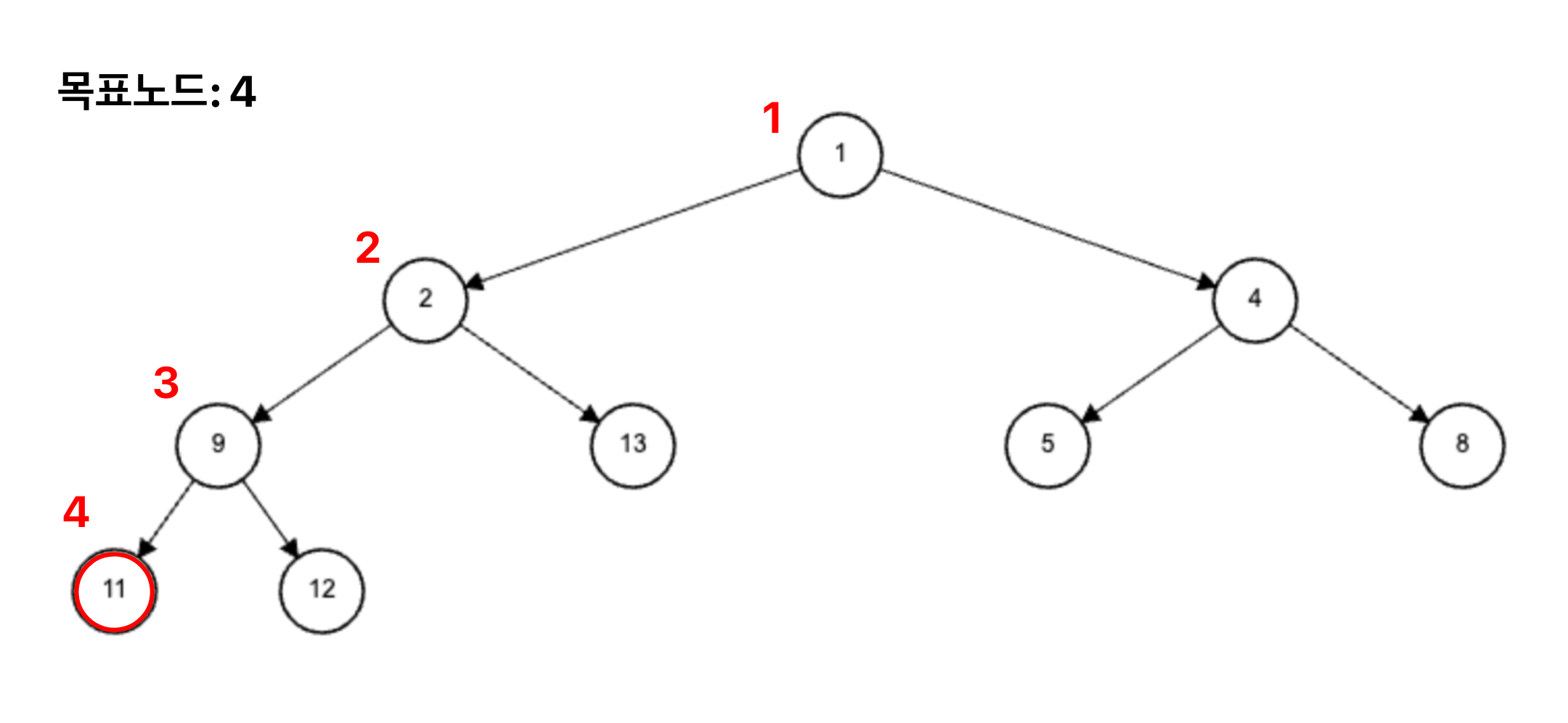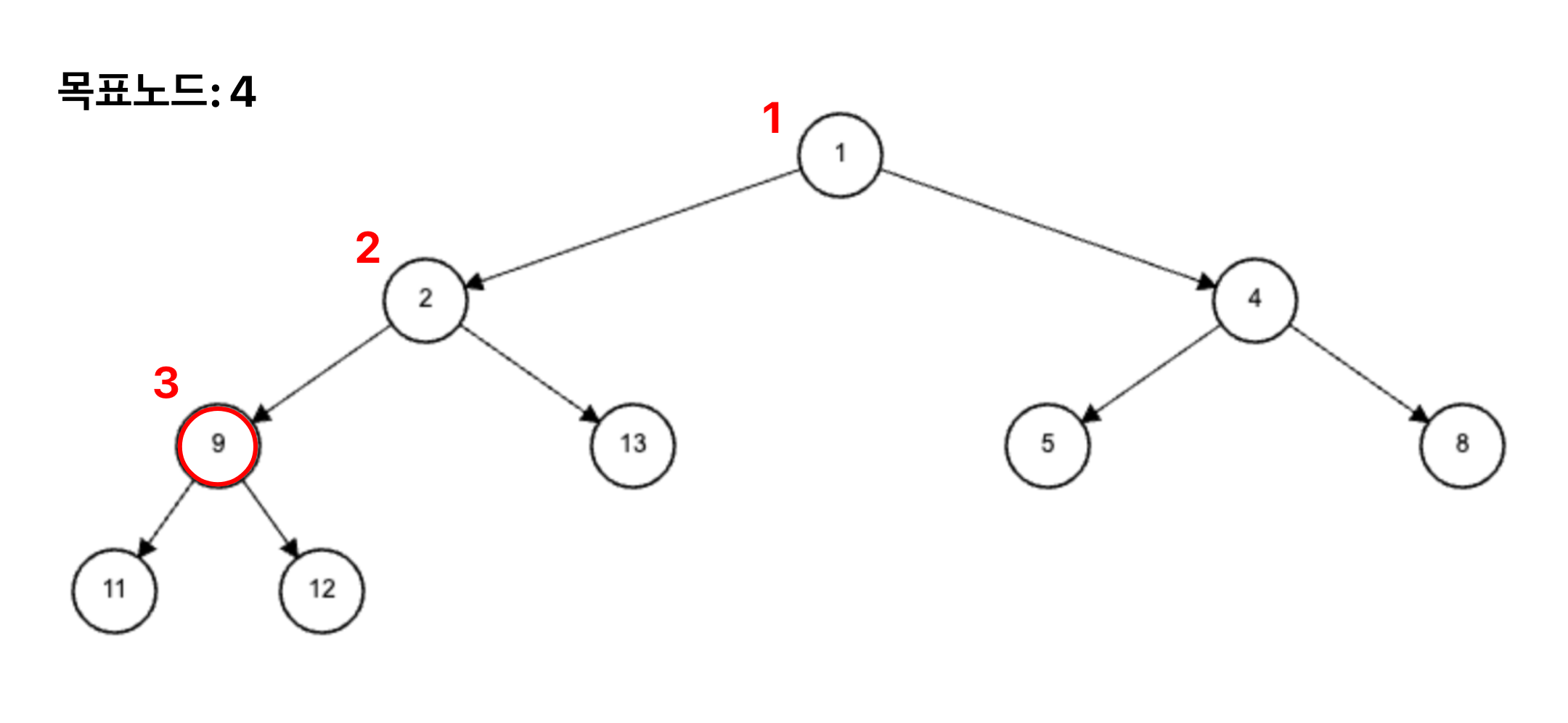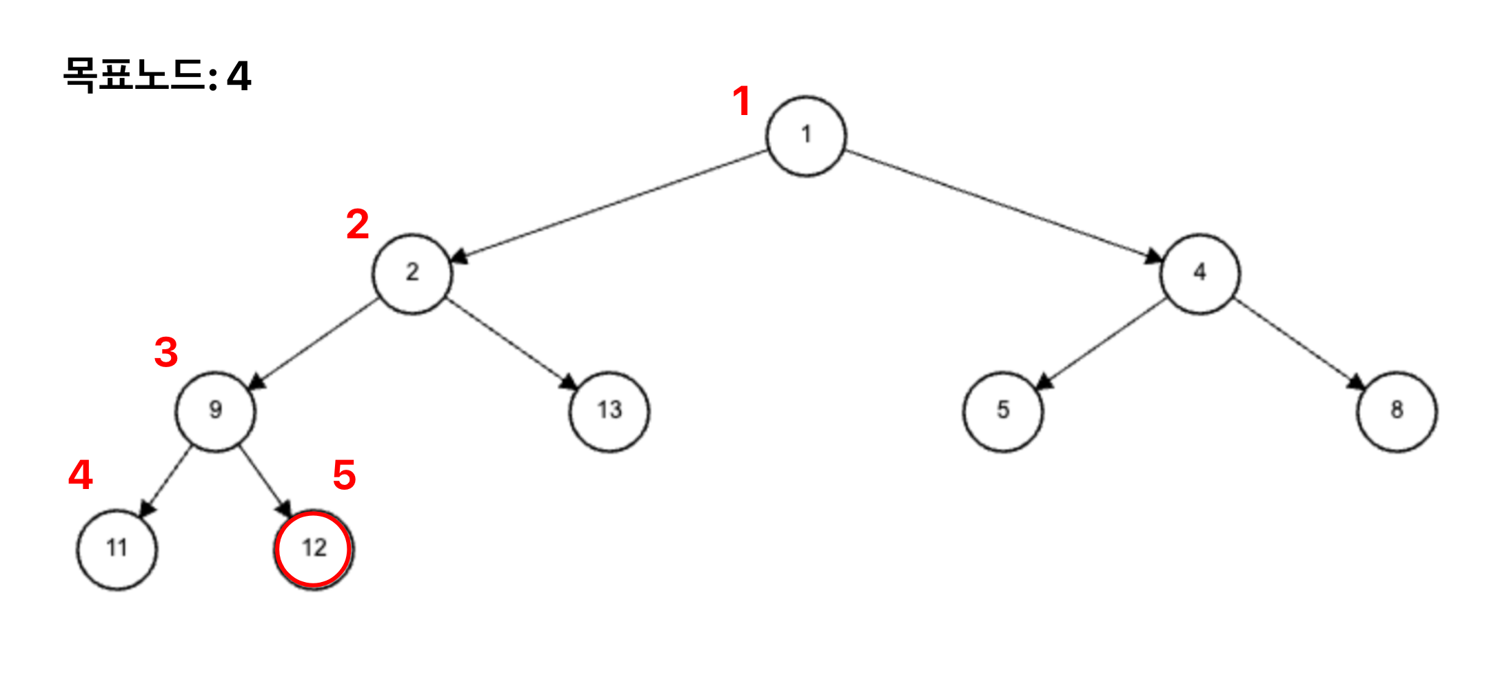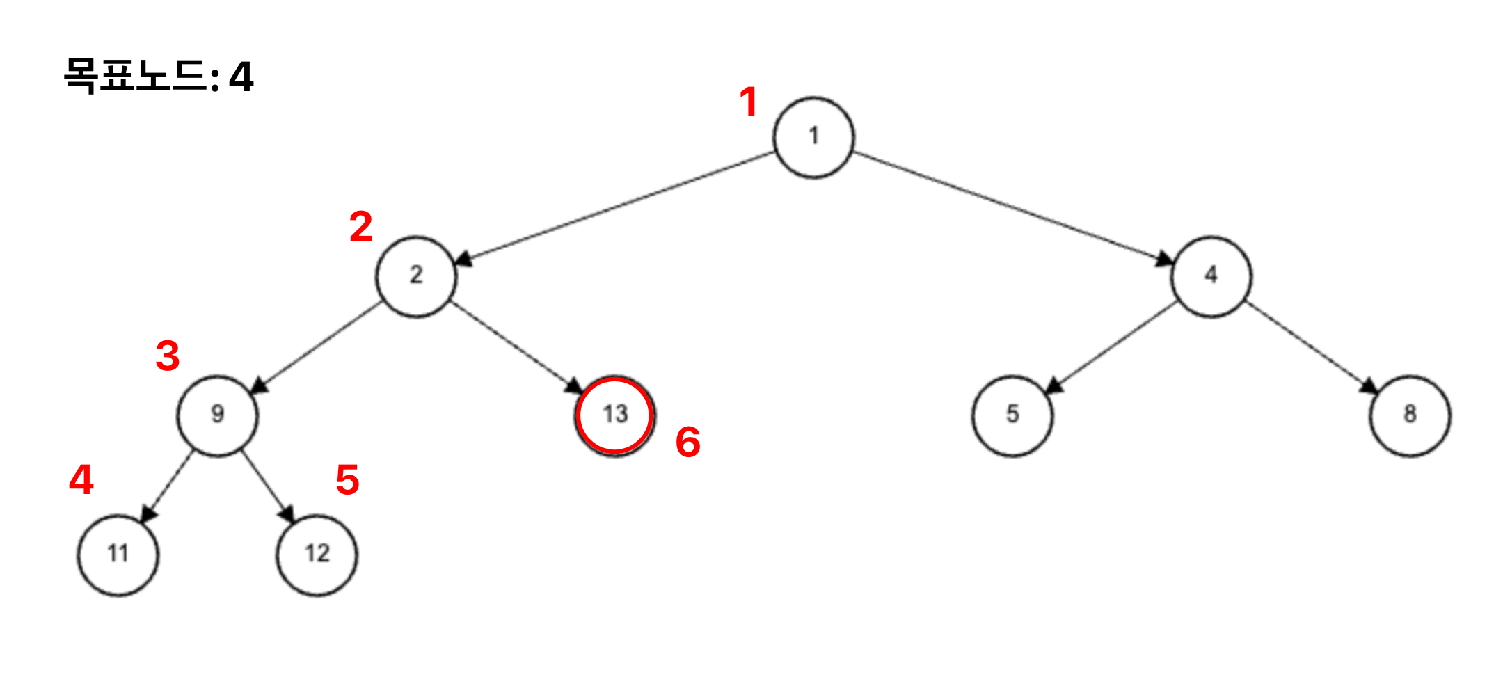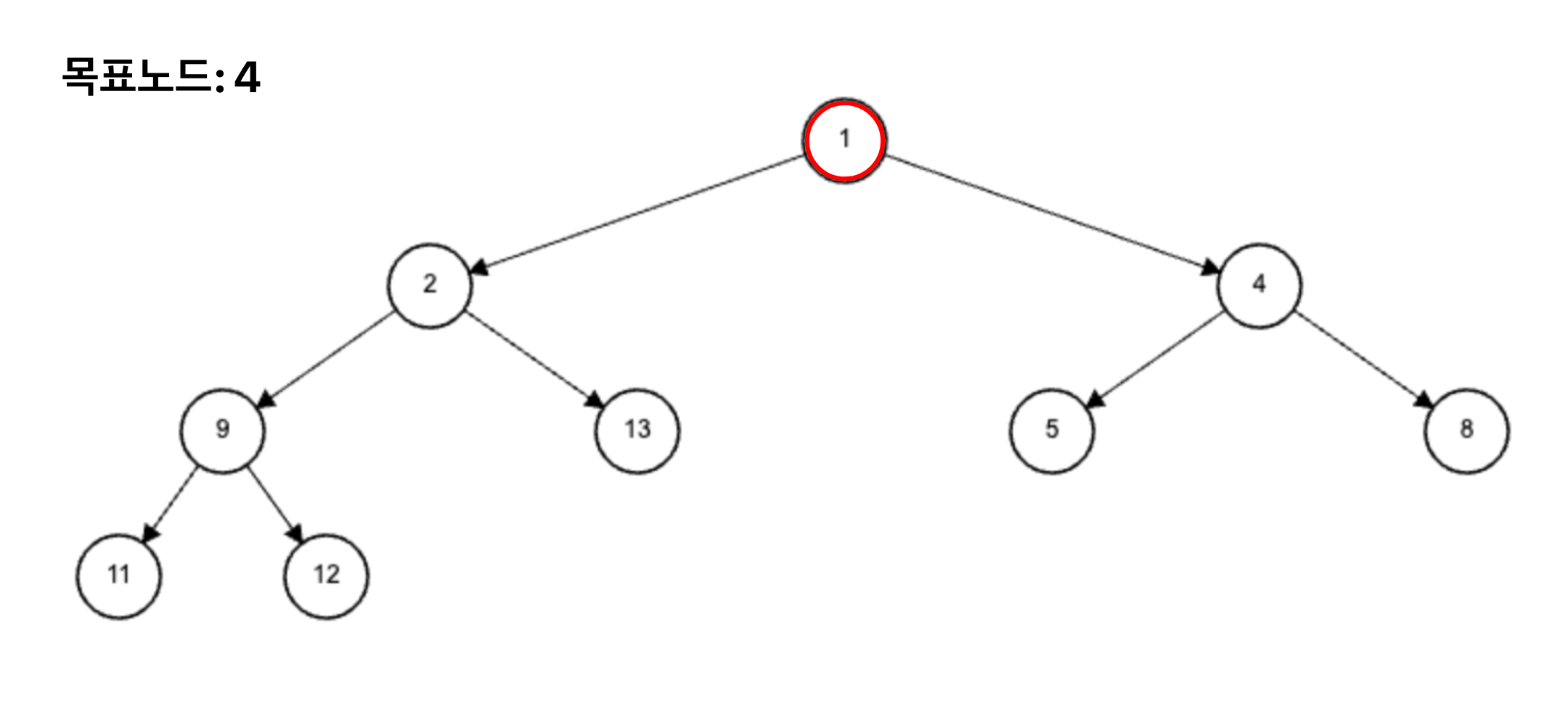 - DFS 알고리즘을 진행하는 탐색 방향은 그래프에 저장된 노드의 순서대로 탐색을 진행한다. 해당 예시에서는 왼쪽 자식노드가 오른쪽 자식노드보다 앞에 있다고 가정한다. 초기 노드 1에서 시작해 4의 값을 가지는 목표 노드를 찾아보자.