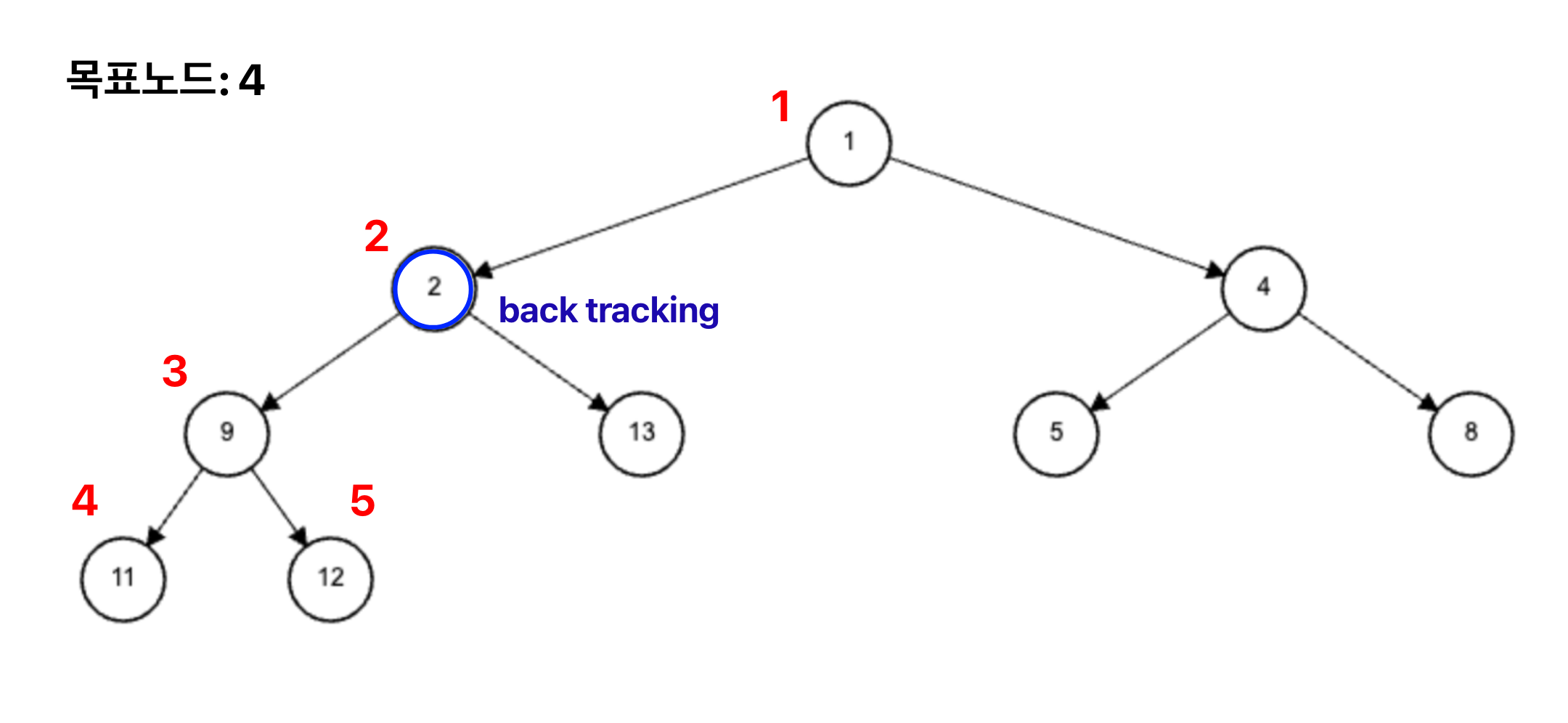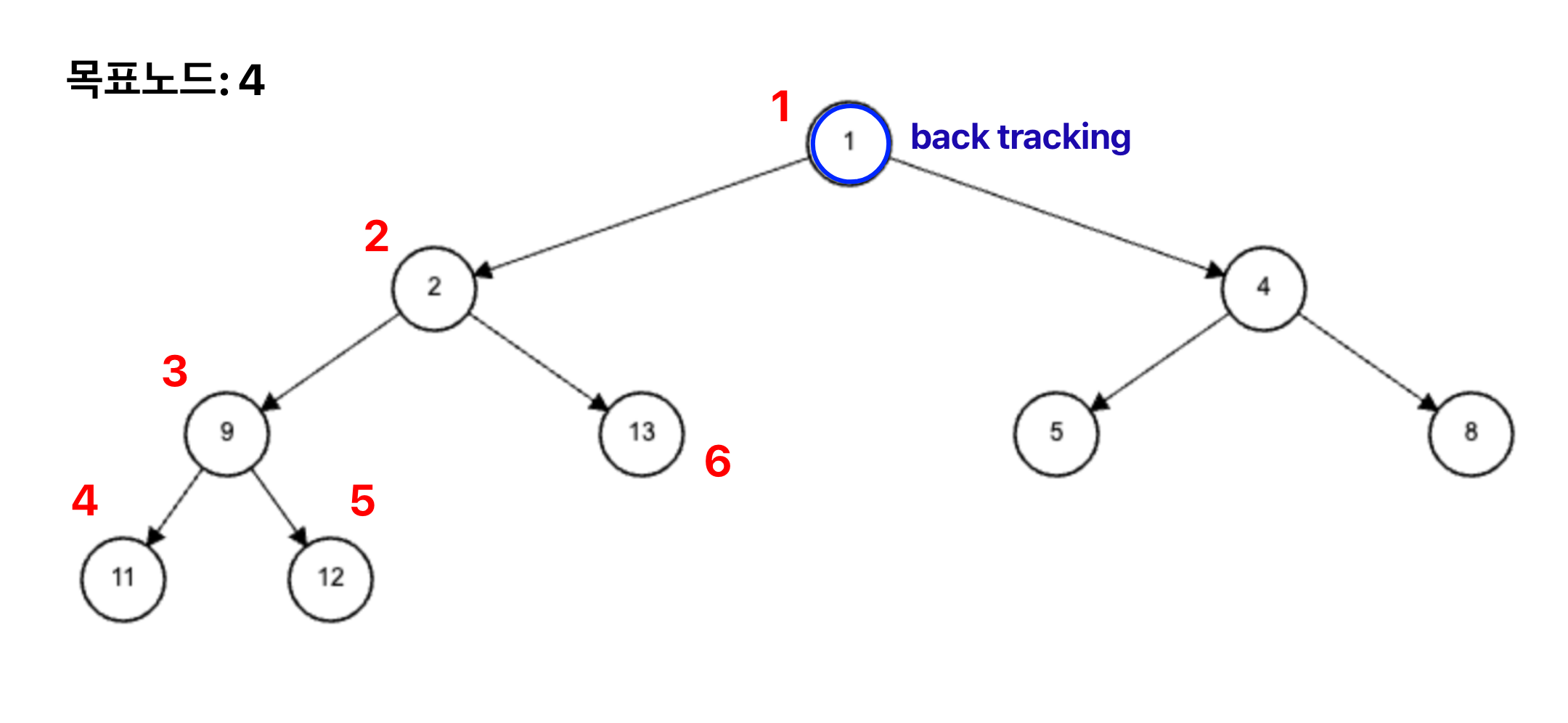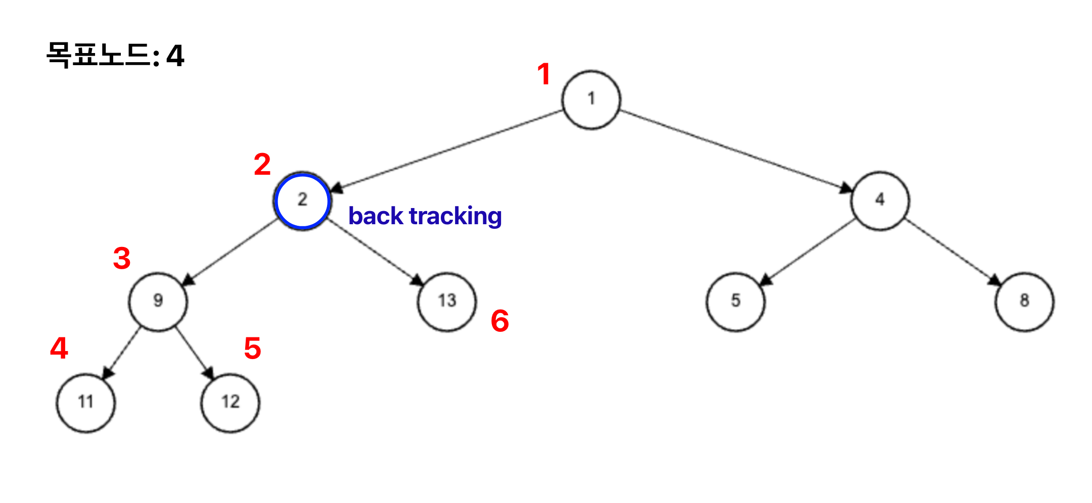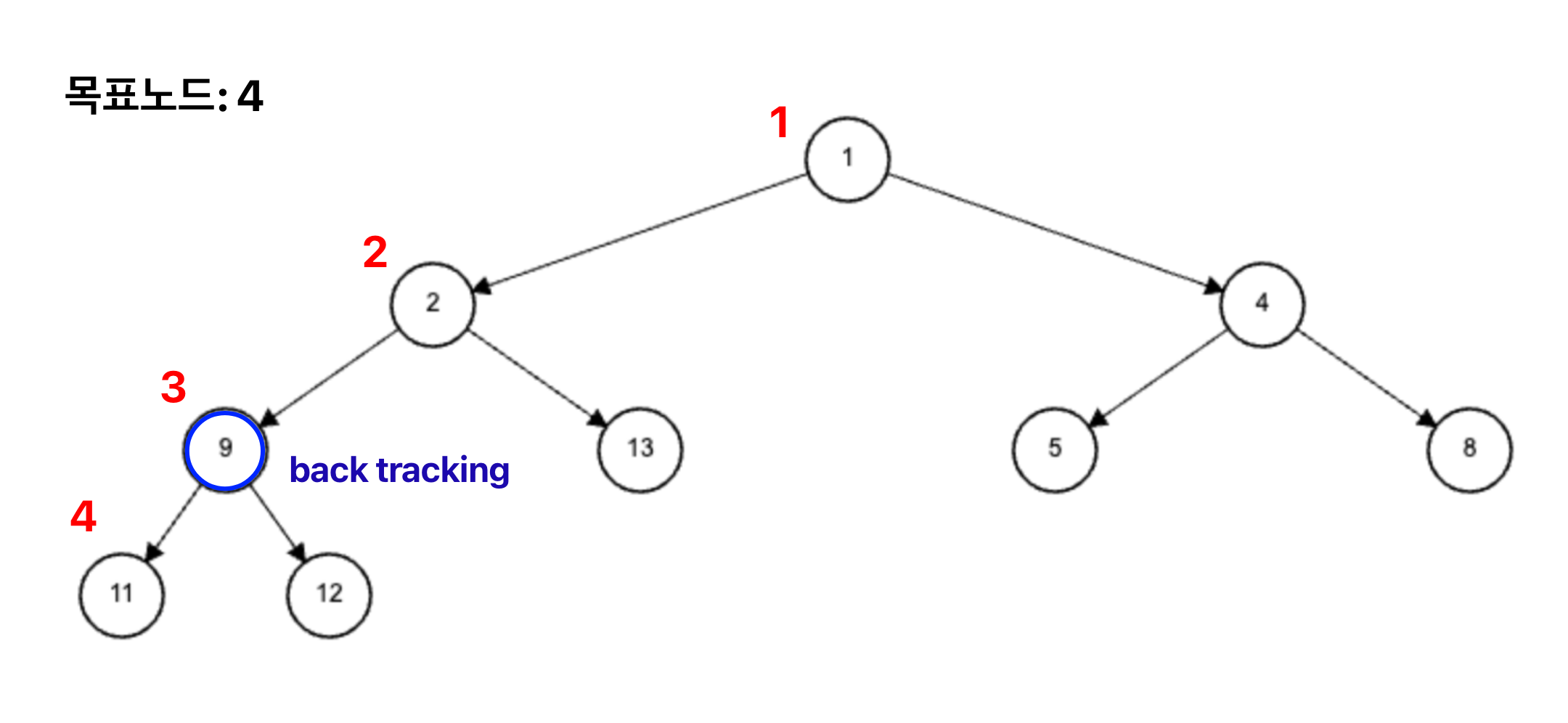 - 9번 노드 또한 목표 노드가 아니기 때문에 11번 노드로 현재 위치를 이동하는데 문제가 발생한다. 더 이상 아래로 내려갈 수 있는 방법이 없다는 것이다. 이때, 백트래킹이라는 개념이 동작한다. DFS에서 백트래킹은 지나온 노드로 돌아가면서 다시 아래로 진행 가능한 노드가 있는지 찾는 과정을 의미한다.