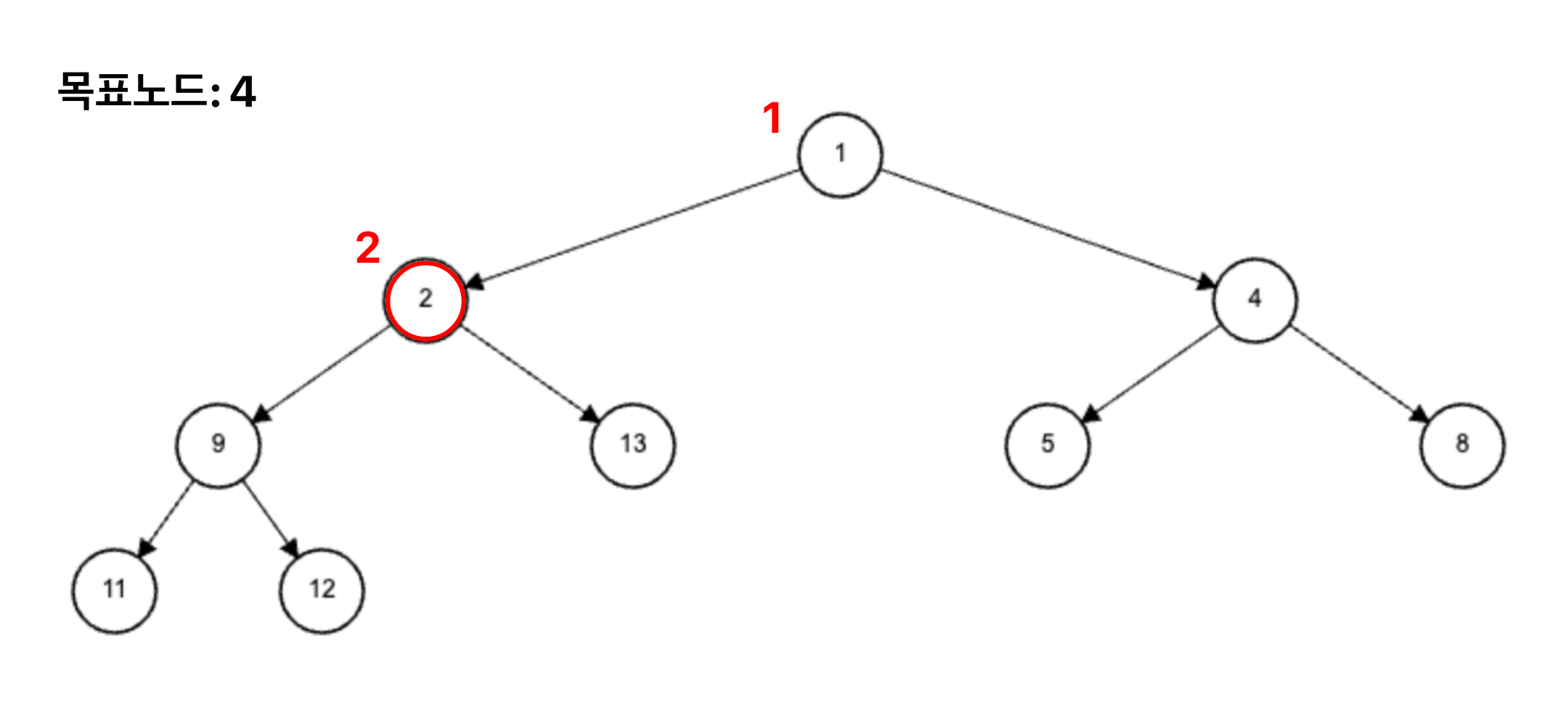 - 그래프상에서 2번 노드가 4번 노드보다 먼저 위치하기 때문에 2번 노드로 위치를 이동한다. 아쉽게도 2번 노드는 목표노드가 아니기때문에 더 깊이 탐색해야한다.