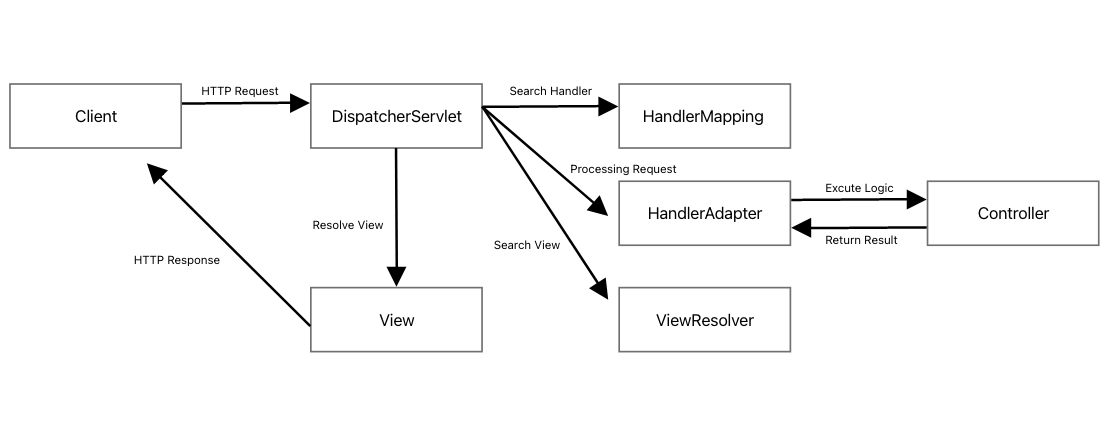 HandlerAdapter를 통해 결과를 반환받은 DispatcherServlet은 이를 클라이언트에 반환한다. Spring MVC 라면 ModelAndView를 반환해 ViewResolver를 호출할 것이고, Rest API를 이용한다면 ViewResolver를 거치지 않고 클라이언트에 응답을 전해준다.