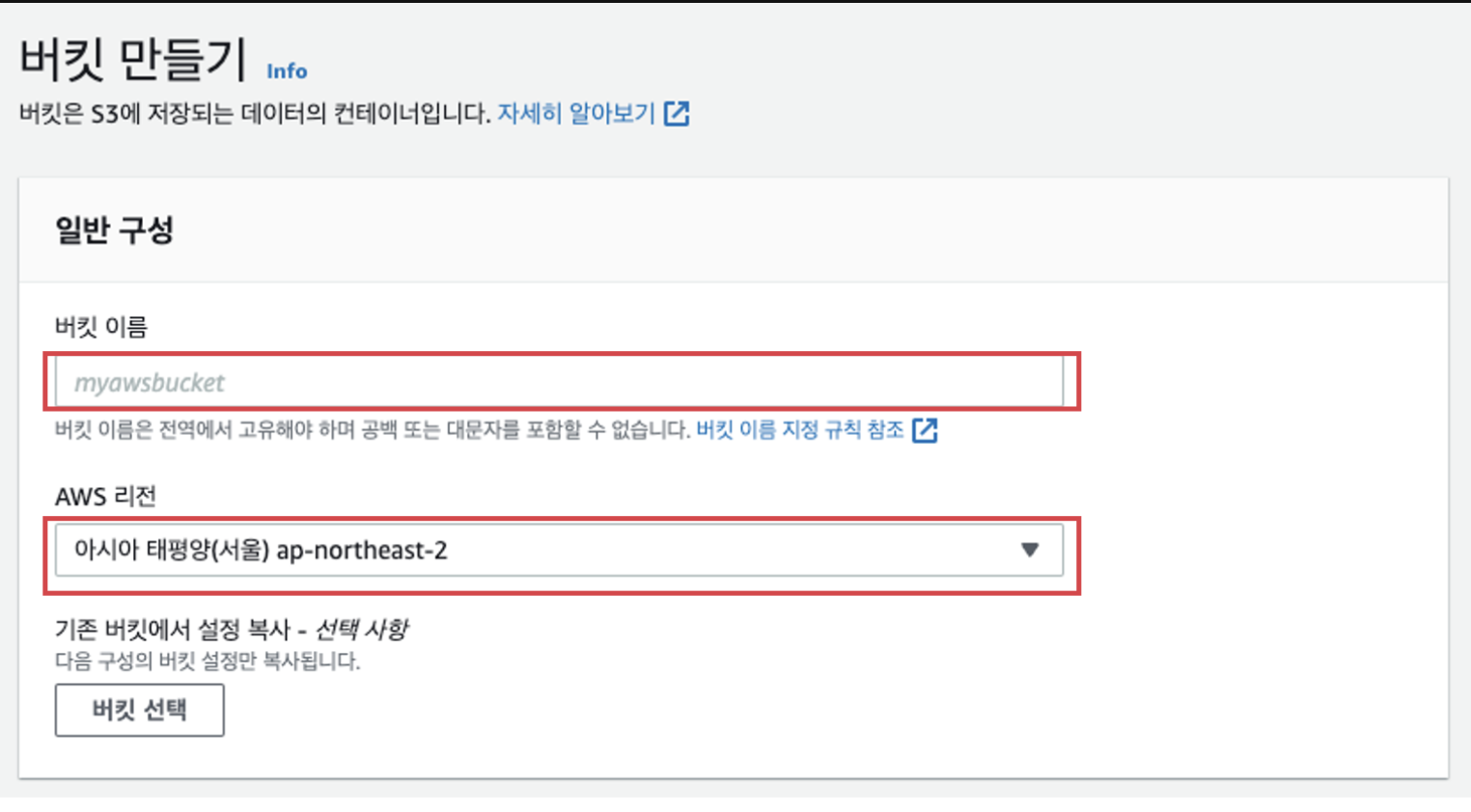 버킷 이름을 작성하고 AWS 리전은 본인과 가장 가까운 곳으로 지정해준다. AWS 리전은 실제 스토리지 기기가 있는 곳이므로 가까울 수록 좋다.