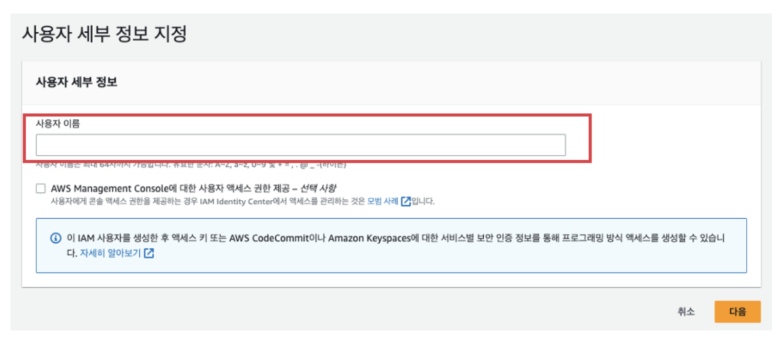 사용자 이름을 설정한다. 나는 프로젝트 이름이랑 bucket이름을 섞어서 설정했다.