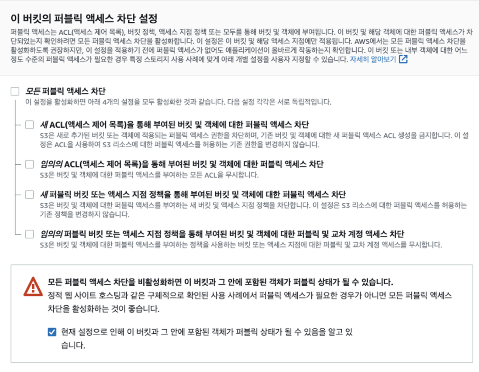 퍼블릭 엑세스는 외부에서 파일 시스템에 접근하는 것을 허용한다는 것인데 나는 웹서비스를 만들것이디 때문에 허용으로 설정했다. AWS에서 제공하는 대부분의 서비스는 생성 후 옵션 수정이 가능하기 때문에 나머지는 기본 설정 그대로 두고 bucket을 생성했다.