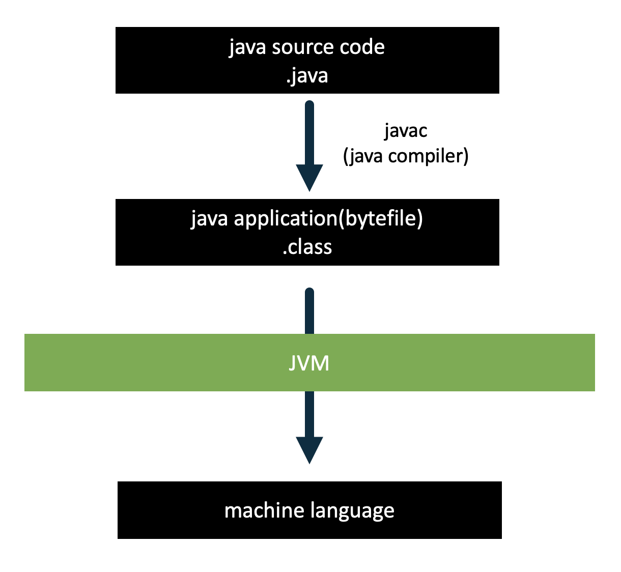 Java는 사람이 읽기 쉬운 High-Level Language이기 때문에 기계가 읽을 수 없다. 따라서, 0과1로 이루어진 이진수의 코드로 변환해줘야하는데 그 과정을 간단하게 표현하자면 아래와 같다. 우리가 작성한 소스파일(.java)이 JDK의 java compiler를 통해 바이트코드파일(.class)로 변환되고 JRE의 JVM이 이를 OS가 이해할 수 있는 기계어로 변환한다.