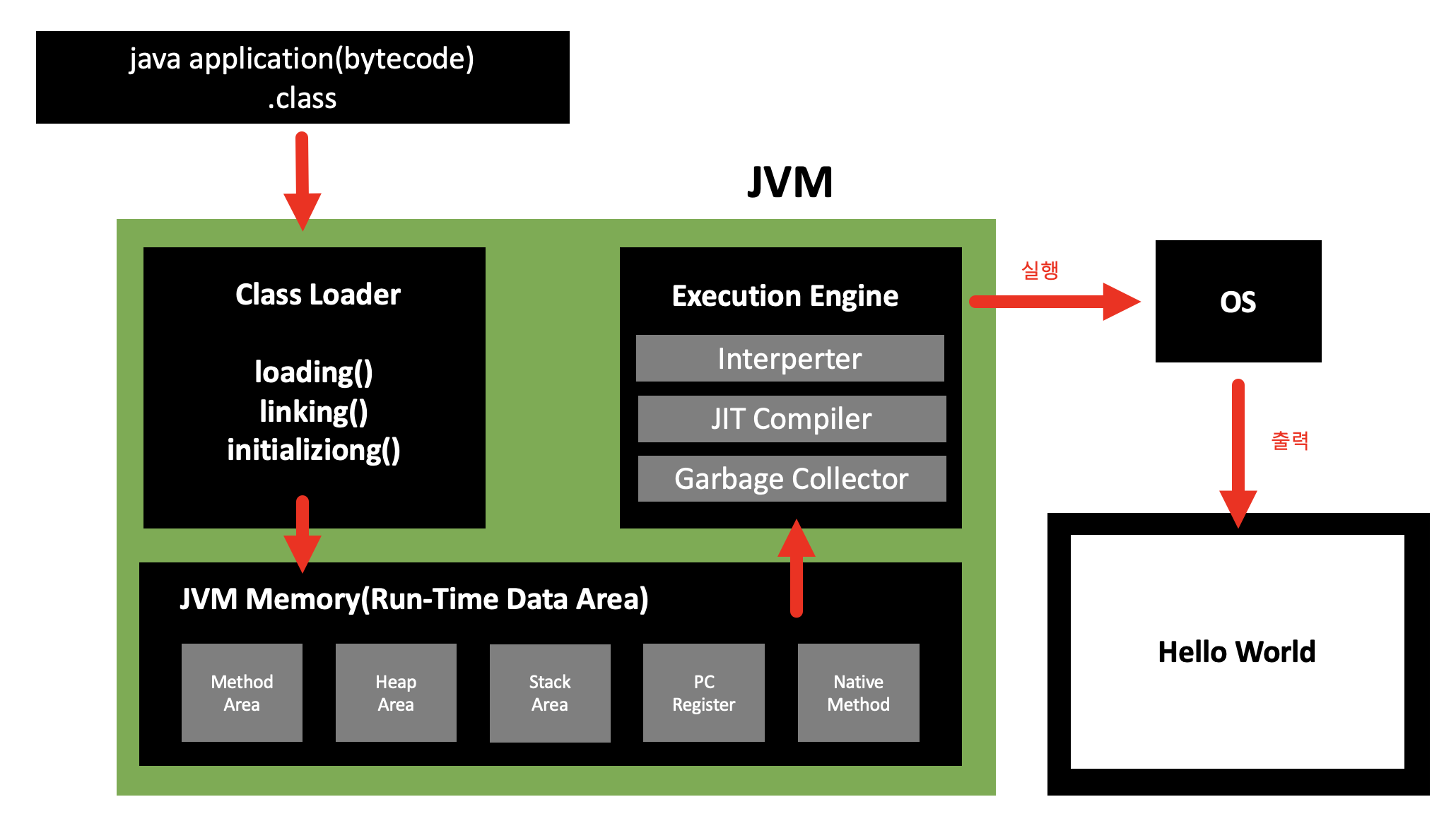 JVM에서 .class 바이트코드를 읽어 기계어로 변환하고 실행하는 과정은 아래와 같다. 컴파일된 .class 바이트파일을 Class Loader가 동적으로 메모리에 로딩하는데 그 작업은 크게 loading, linking, initializing으로 분류된다. 이후 Execution Engine에서 JVM Memory 영역에 있는 바이트코드를 읽어 네이티브 코드로 변환하고 마침내 OS가 이를 읽고 실행한다. Class Loader와 Execution Engine에 대한 설명은 아래를 참고하자.