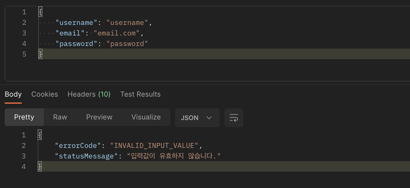 //검사 결과 @Pattern이 걸려있는 email과 password의 값이 유효하지 않으면 MethodArgumentNotValidException이 발생한다.