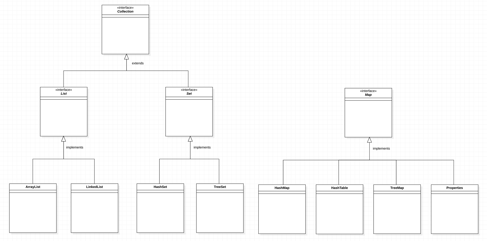 자바에서는 효율적인 데이터의 추가 · 삭제 · 검색 등을 돕기 위한 자료구조 인터페이스들을 java.util 패키지에 포함시켜 놓았다. 이들을 Collection Framework라고 총칭하며 우리가 자주 사용하는 List , Set, Map이 대표적이다. 아래 그림을 보면 Collection Framework는 크게 Collection 인터페이스와 Map 인터페이스로 나뉜다. List, Set의 경우 객체를 추가 · 삭제 · 검색하는 방법에 공통점이 있기 때문에 Collection 인터페이스를 정의해 이를 확장하는 방식으로 사용하고 있다.