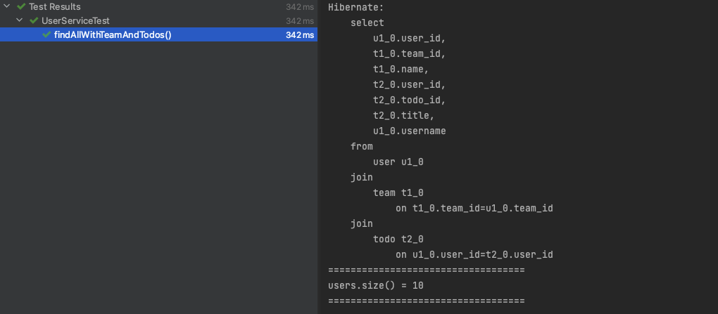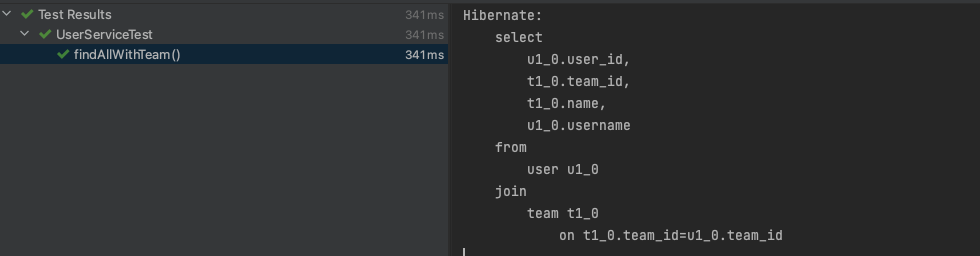 //fetchType이 EAGER일때: EAGER로 설정되어있기 때문에 findAll()시에 모든 user를 찾는 query 1번과 team을 불러오는 query 10번이 추가로 실행된다. -> query 총 11번
