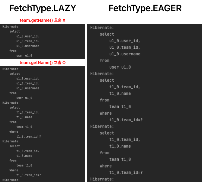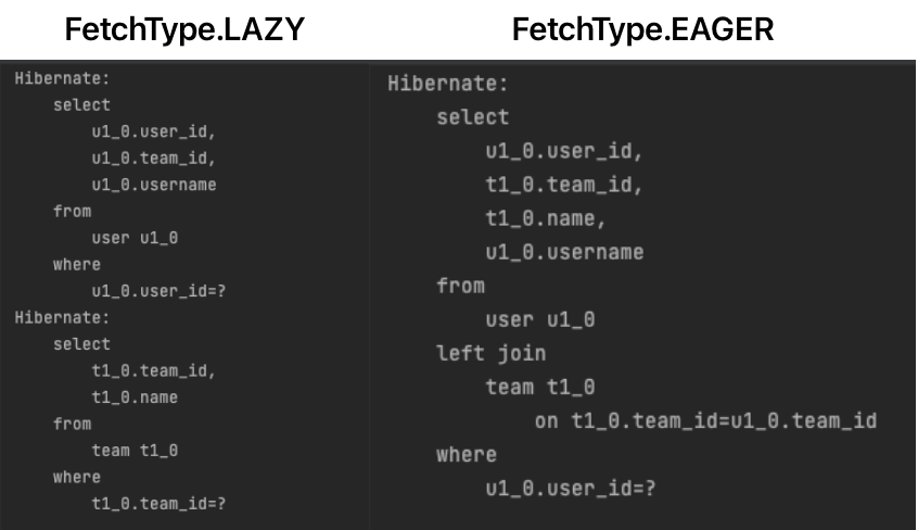 //fetchType이 LAZY일때: EAGER와 같이 N+1 문제가 발생한다. 하지만, EAGER는 user를 가져올때 이미 문제가 발생하지만 LAZY는 이후 team을 호출할때 query가 발생하게 된다. -> query 총 11번