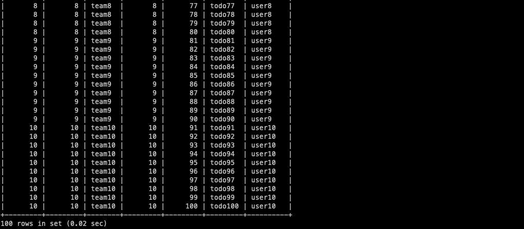 1:N 관계에서도 fetch join을 이용해 1+N 문제를 잘 해결하지만, 한가지 문제점이 있다. 위 코드의 결과를 보면 users 리스트의 크기가 10으로 출력되는데 hibernate가 날린 쿼리를 그대로 DB에서 실행해보면 아래와 같다. user별로 todo를 10개씩 생성해놨는데 jpa는 10개의 데이터를 반환하는 반면 DB에서는 100개의 데이터를 반환한다.