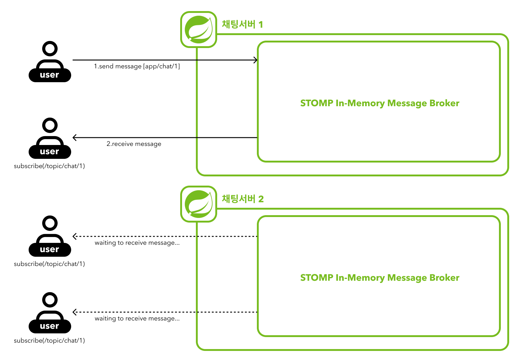 개선 전 서버 스케일아웃 시 발생하는 문제에 대한 아키텍처이다. 스케일아웃된 서버를 운영할 경우 사용자들의 요청은 서로 다른 서버에 도달할 것이고 웹소켓 연결 또한 서로 다른 서버와 맺을 것이다. 여기서 발생하는 문제점은 사용자가 특정 채팅방에 메시지를 보낸다고 할때 메시지 발신자와 동일한 서버를 구독중인 사용자들에게는 메시지가 잘 도착하겠지만, 같은 채팅방이라도 다른 서버를 구독중인 사용자에게는 메시지가 전송되지 않는다는 것이다. 인메모리 브로커는 서버마다 독립적으로 운영되기 때문에 다른 서버의 브로커는 메시지를 전달받지 못했기 때문이다.