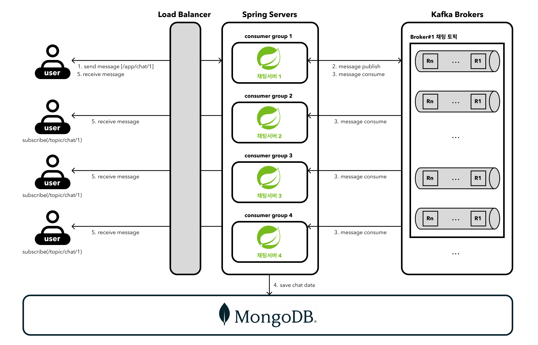 아래는 개발에 들어가기 전 설계한 인메모리 브로커의 문제점을 해결한 아키텍처이다. 인메모리 브로커 대신 외부 메시지큐를 사용함으로써 사용자들이 서로 다른 서버와 연결되어 있더라도 컨슈머 그룹을 각각 고유하게 설정해 같은 토픽을 구독하고 있다면 메시지를 consume 할 수 있게 하였다. 또한, 채팅 메시지 기록을 위해 데이터의 삽입/삭제에 유리한 NoSQL을 사용하고자 했다. 가용 기술 중 Redis와 MongoDB가 있었고 해당 프로젝트에서는 JSON 데이터 저장에 적합한 MongoDB를 사용하기로 결정했다.